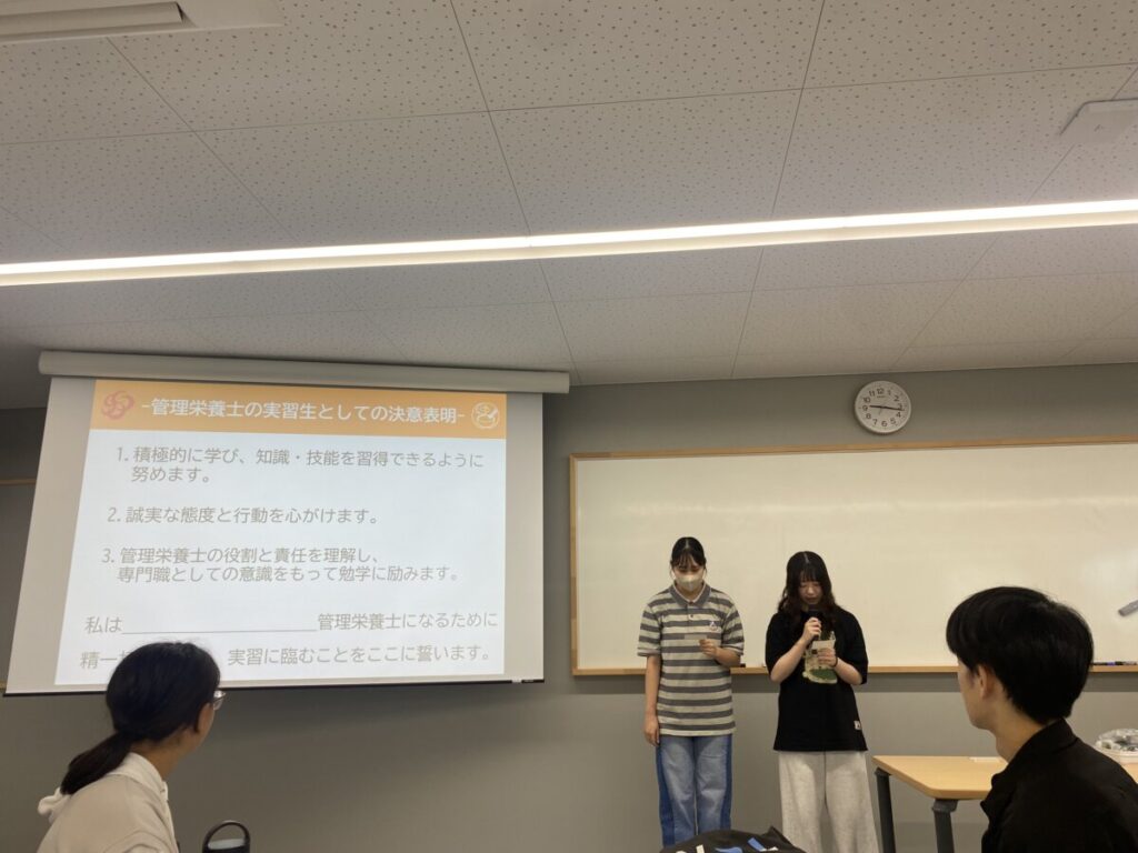 実習に先立って行われた「決意表明式」では、学生一人ひとりが自分の言葉でどのような管理栄養士になりたいのか、そのために臨地実習を通してどのようなことを学びたいのかを決意表明してくれました。
