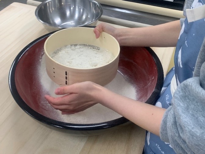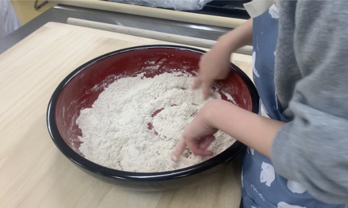 ② 粉全体に水が行き渡るように、指先で粉と水をよく混ぜ合わせる(水まわし)。