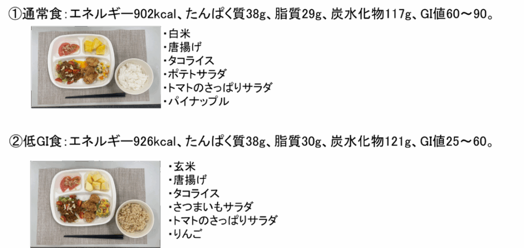 一方、血糖値を上げない食材を組み合わせた、低GI実験では、朝食欠食と比較して昼食後の血糖変動幅は抑制されたものの、通常の昼食を食べたコントロールとの間で血糖変動幅と眠気尺度の変化に違いは認められませんでした。