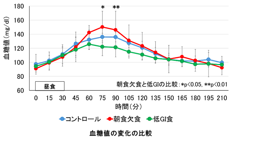 その結果、朝食欠食は、低GI食と比べ、食後45分と60分時点の血糖値が、高い値を示しました。