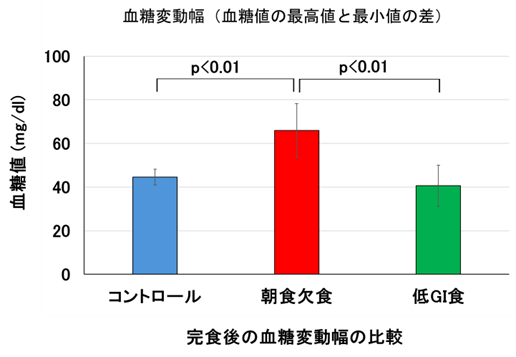 その結果、朝食欠食は、コントロール及び低GI食と比べ、食後の血糖変動幅が高い値を示しました。